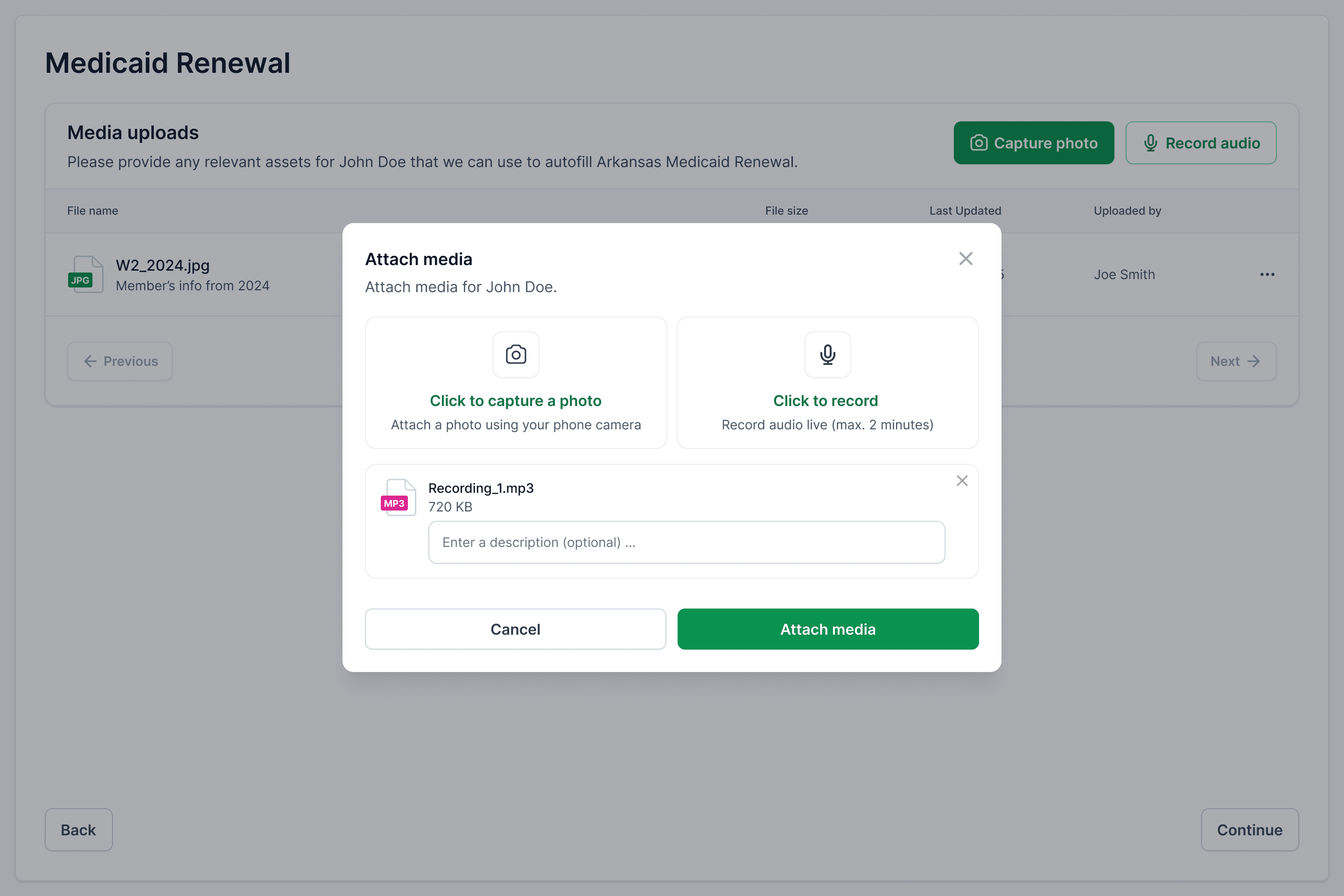 AI autofill through media uploads, only requiring CHW confirmation before submission.