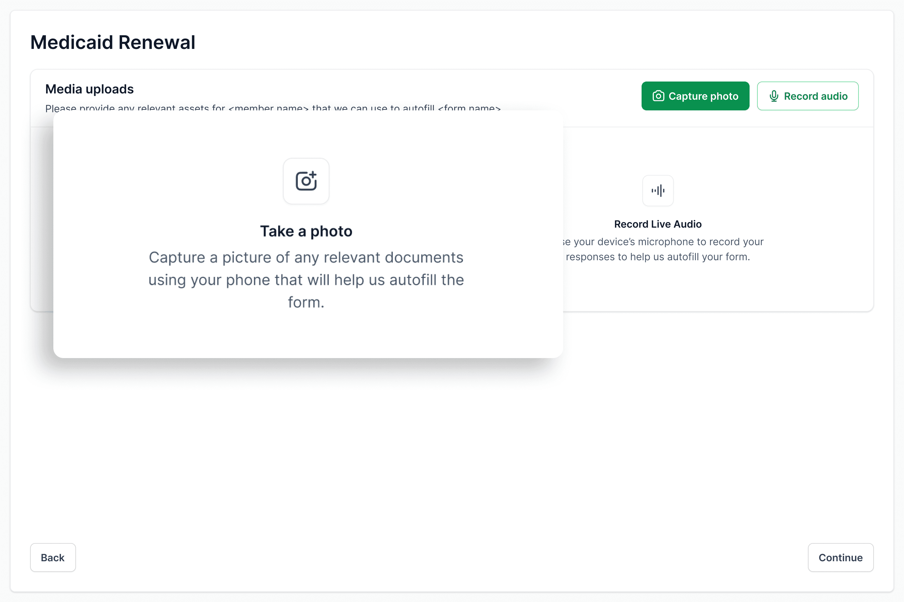 In a meeting with my manager, he brought up the concern of CHWs having full access to a members private information when uploading files. So, a small phrasing change from "Upload a file" to "Take a photo" to enforce instant photo capture and eliminate that safety issue.