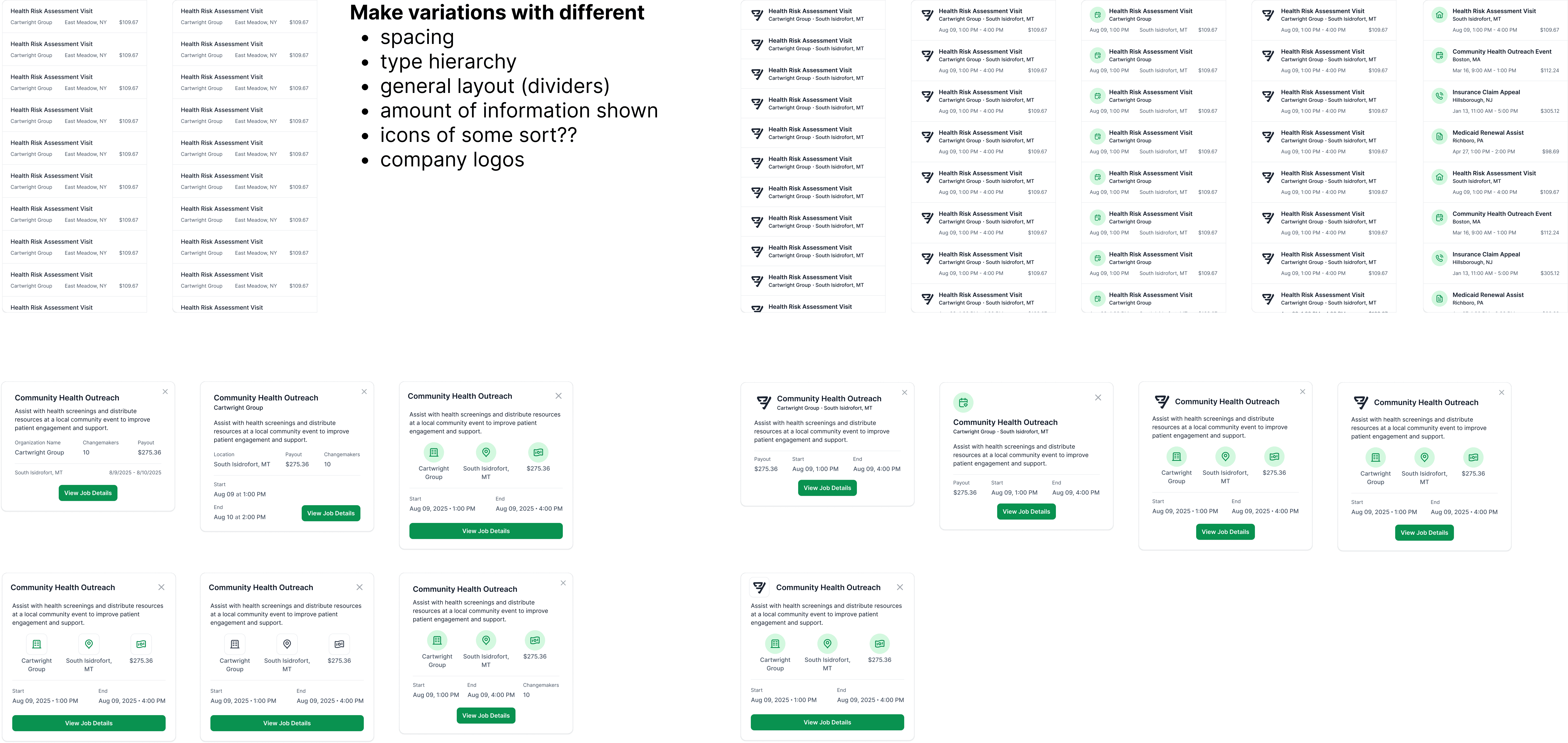 Moving forward, I tried out some variations of both the jobs list and job card, focusing on different spacing, type hierarchy, level of information shown, and icon usage.