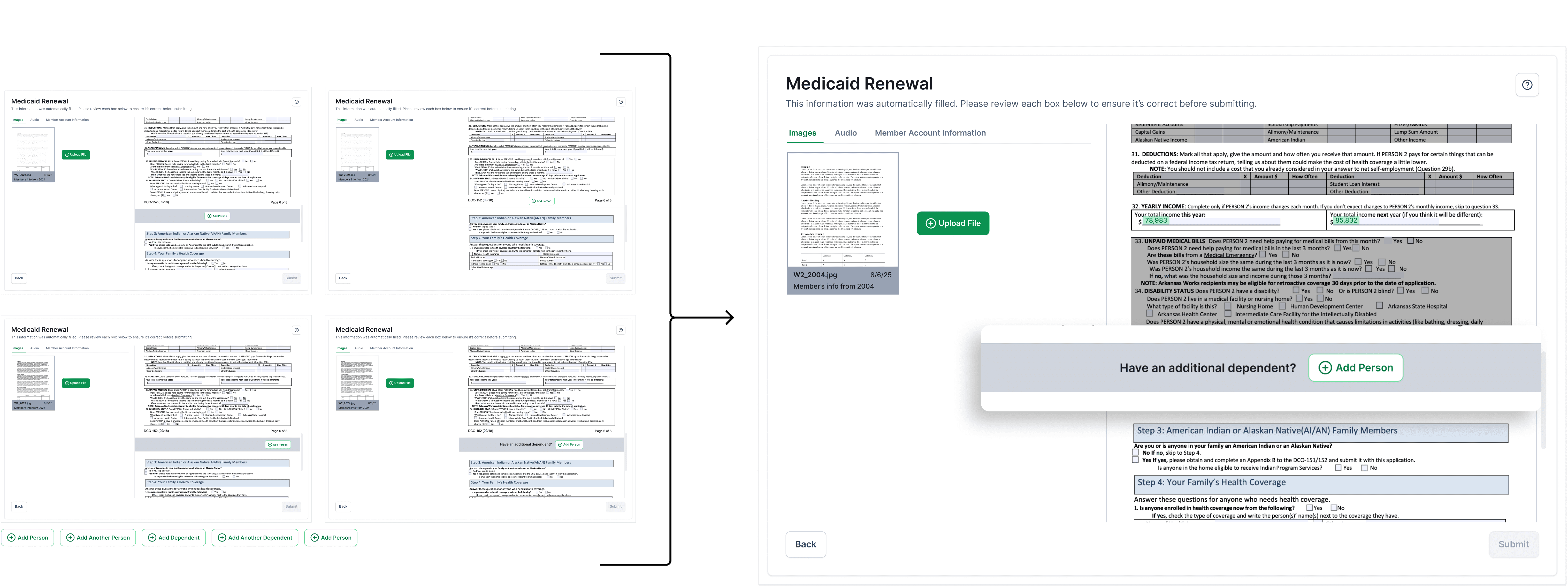 With a base prototype established, a client meeting was held and they brought up thoughts on how to handle additional dependents. So, I brainstormed a few variations of layouts, button types, and text - ultimately landing on a clear question and CTA to direct CHWs.