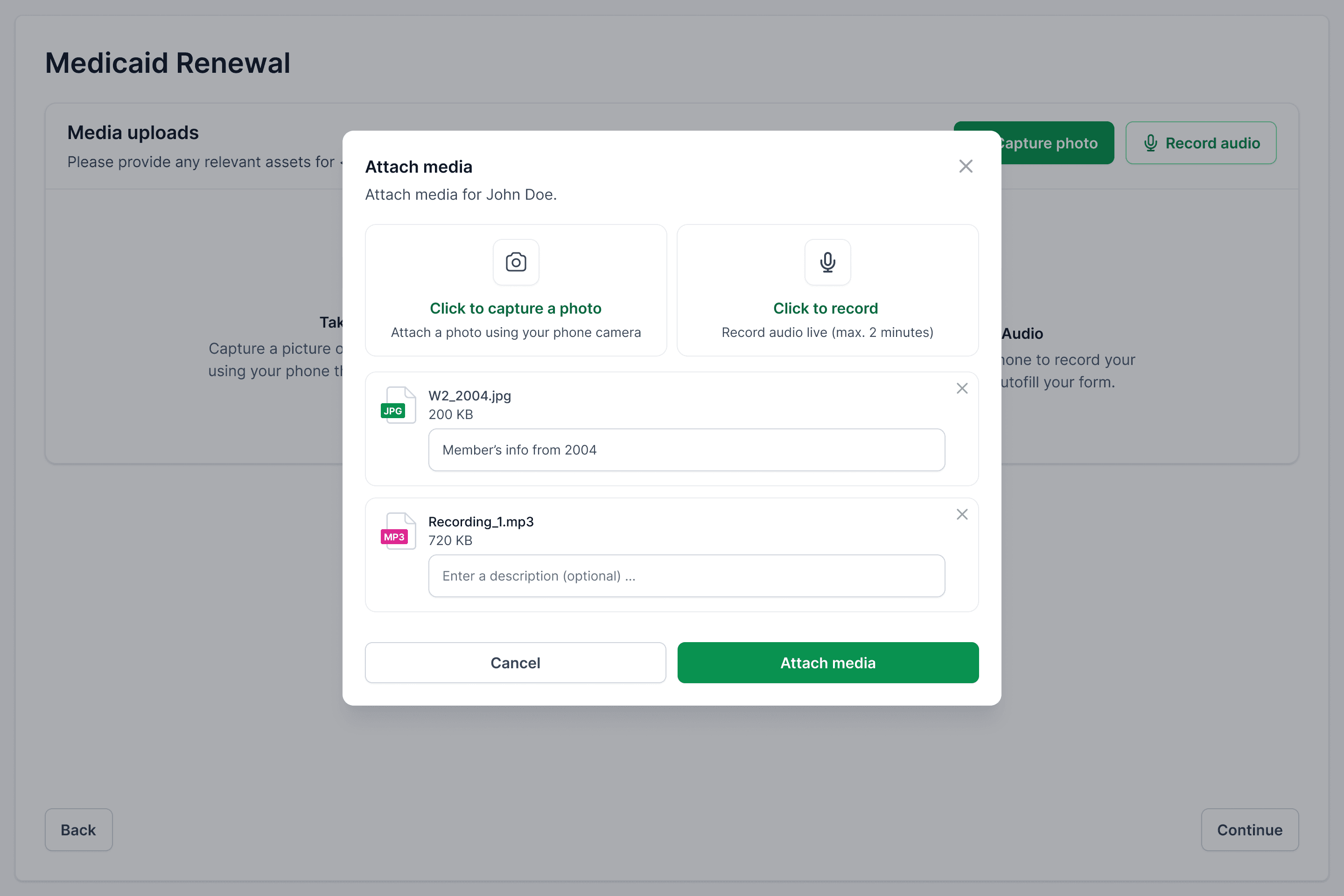 This also freed up the split screen to accommodate the members information and uploaded media, allowing CHWs the ability to upload at this stage as well.