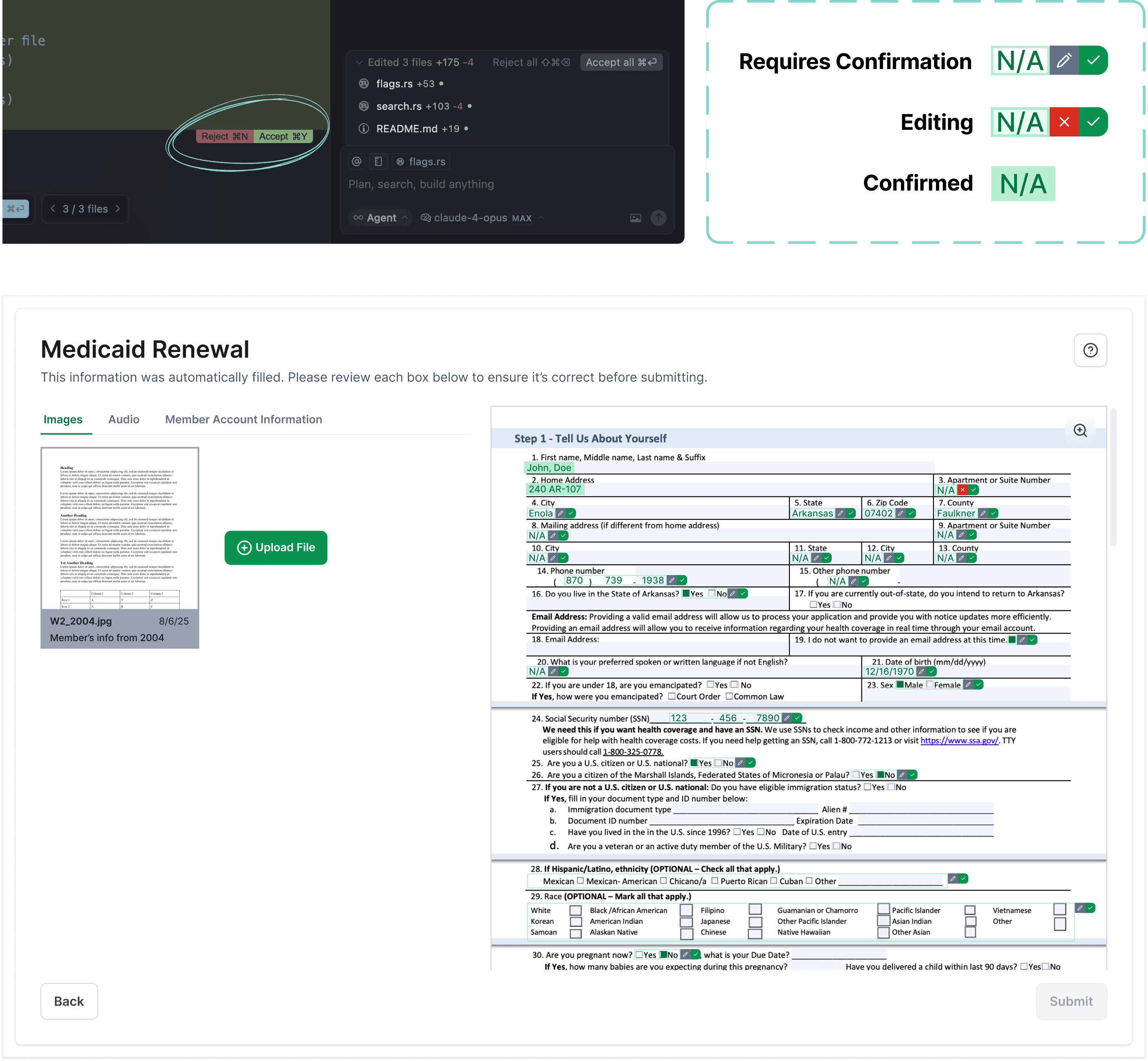 Taking inspiration from code editing confirmations in Cursor, I pivoted towards the concept of tags attached to each field with specific borders and fills to denote status.