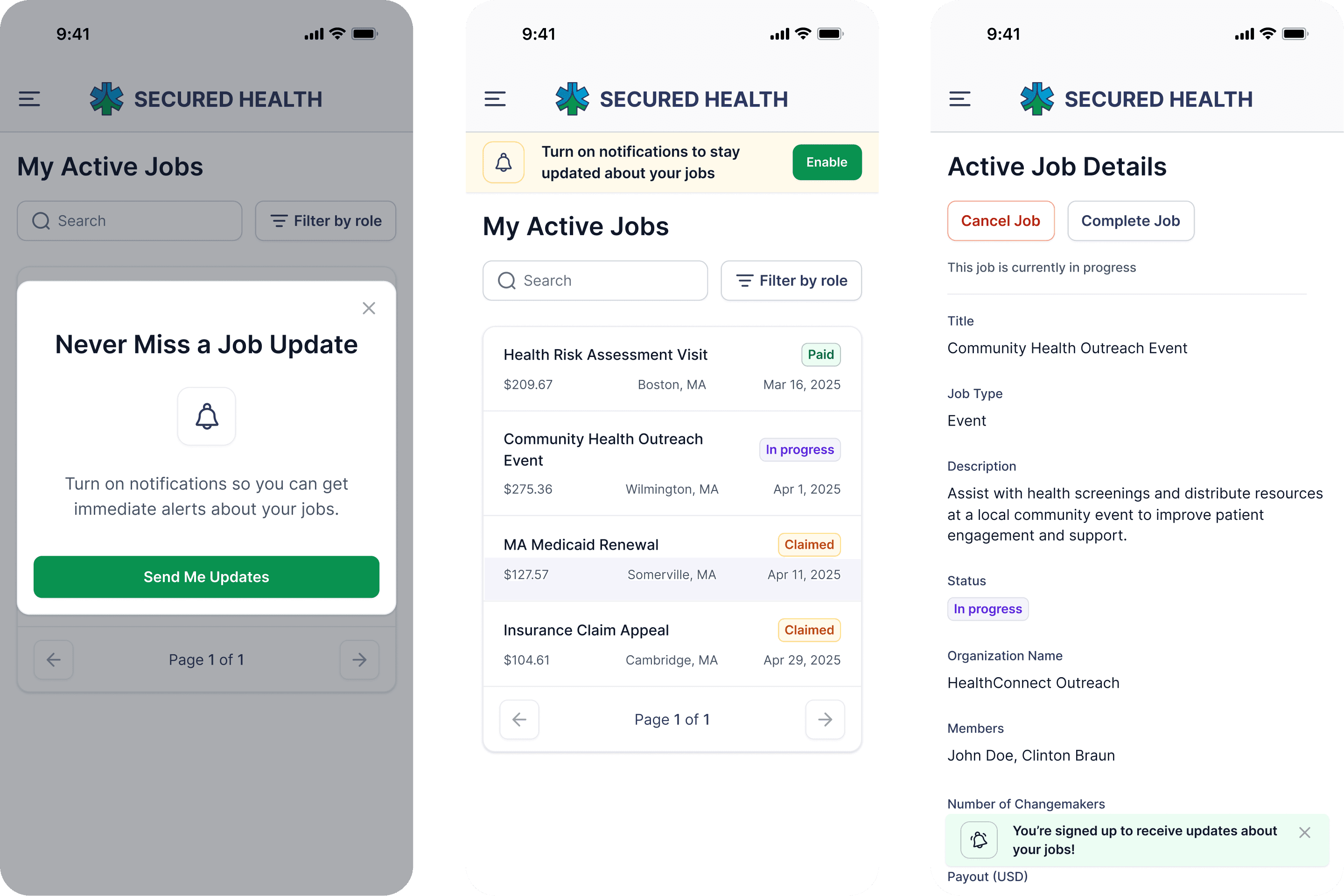 With the active jobs flow established on the web app, I adapted those designs for iOS, adjusting visual hierarchy, padding, and sidebar as needed. At this point, I decided to modify the initial enable notification screens to modals, as it integrated better into the flow of app navigation for CHWs.