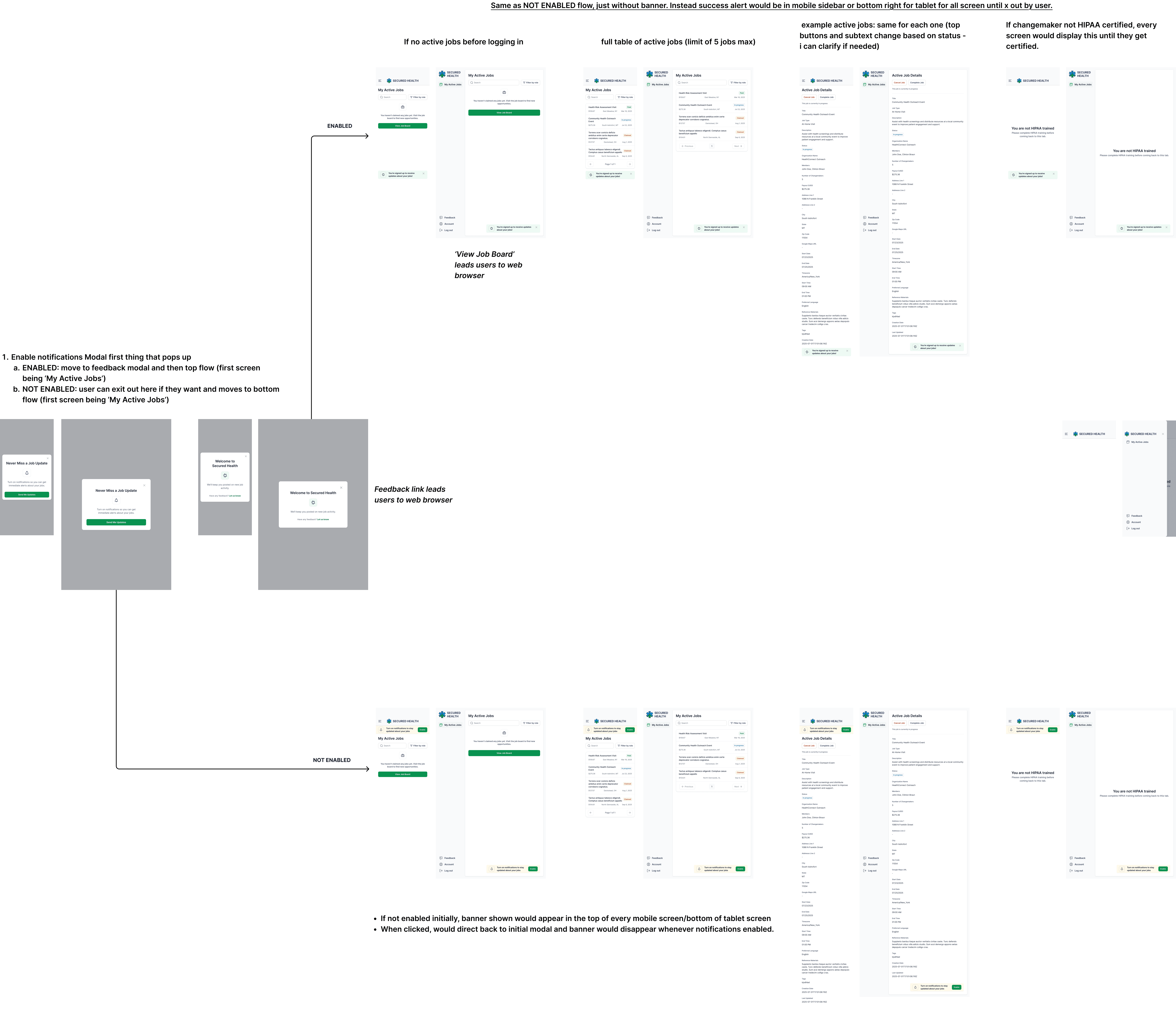 With the rest of the 'Active Jobs' flow already established on the web app, I adapted those designs for iOS, adjusting visual hierarchy, padding, and sidebar as needed. At this point, I decided to modify the initial 'Enable Notifications' screens to modals, as I felt it would integrate better into the flow of app navigation for CHWs.